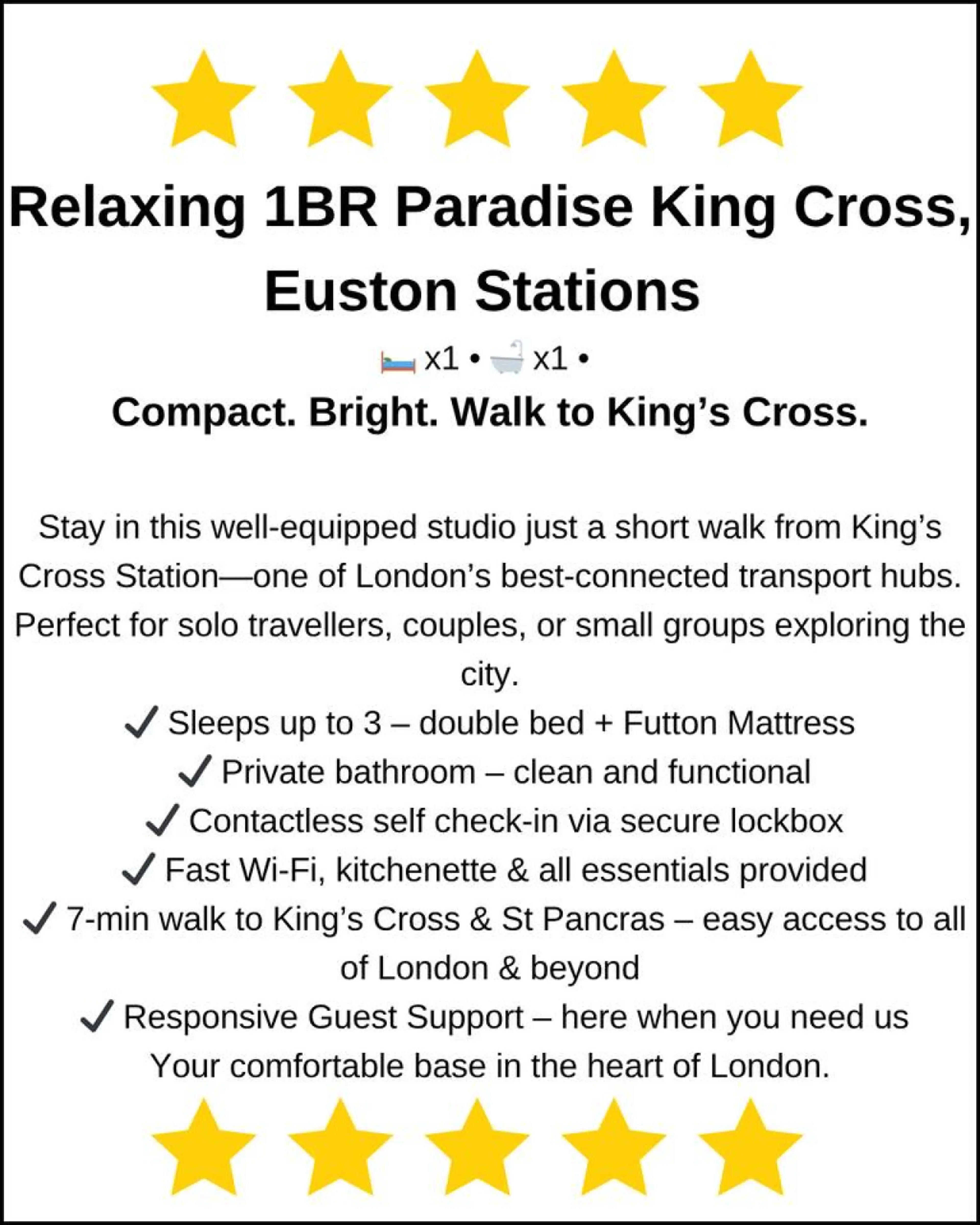 Cozy 1BR Flat Walk to Kings Cross & Euston Station