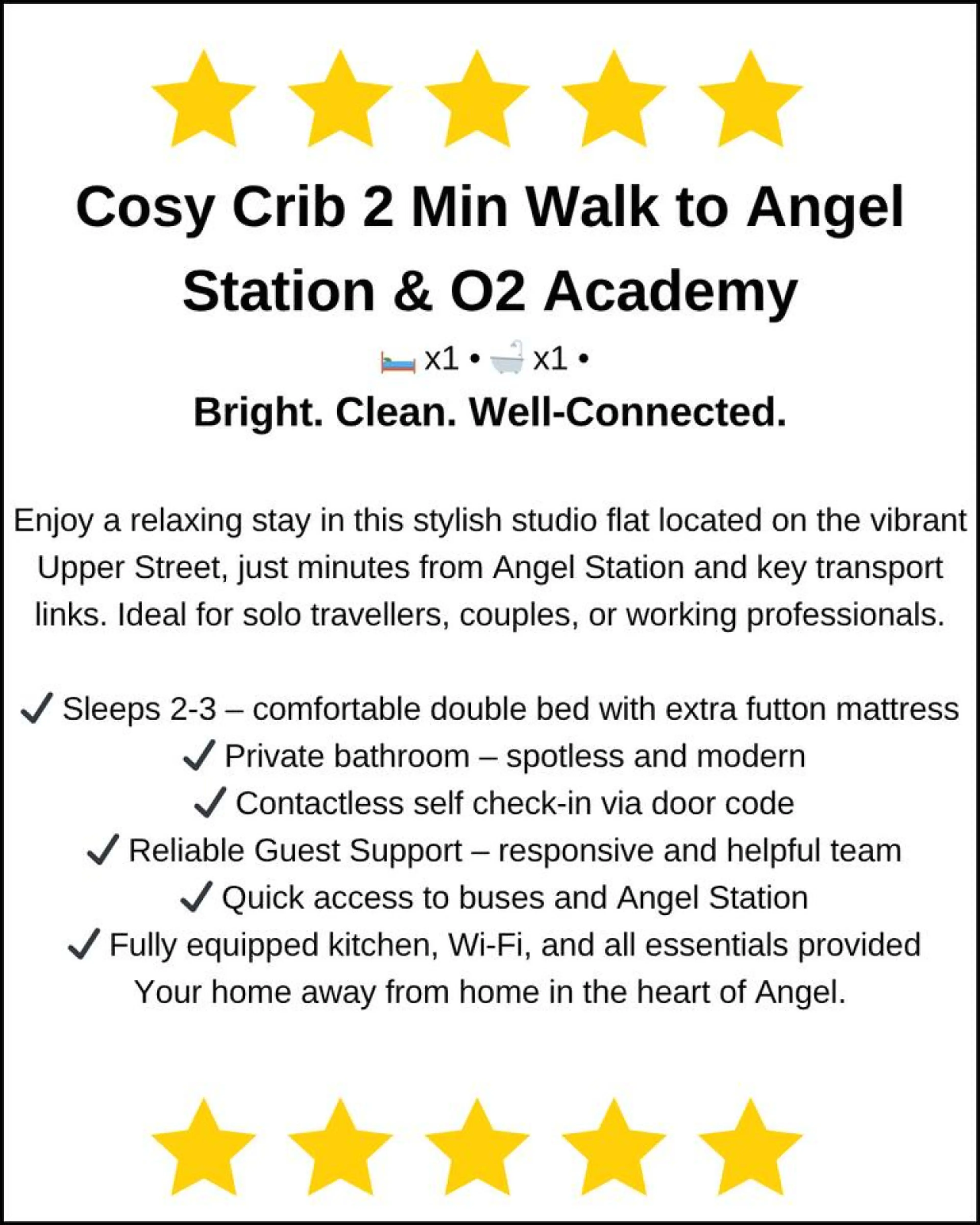 Welcome to Urban Oasis Apartments! This stylish and centrally located apartment on Upper Street NW1 is just a short walk from the O2 Academy and Angel Station, placing you in the heart of one of London’s most vibrant areas. Step outside and discover a world of dining, entertainment, shopping, and ...