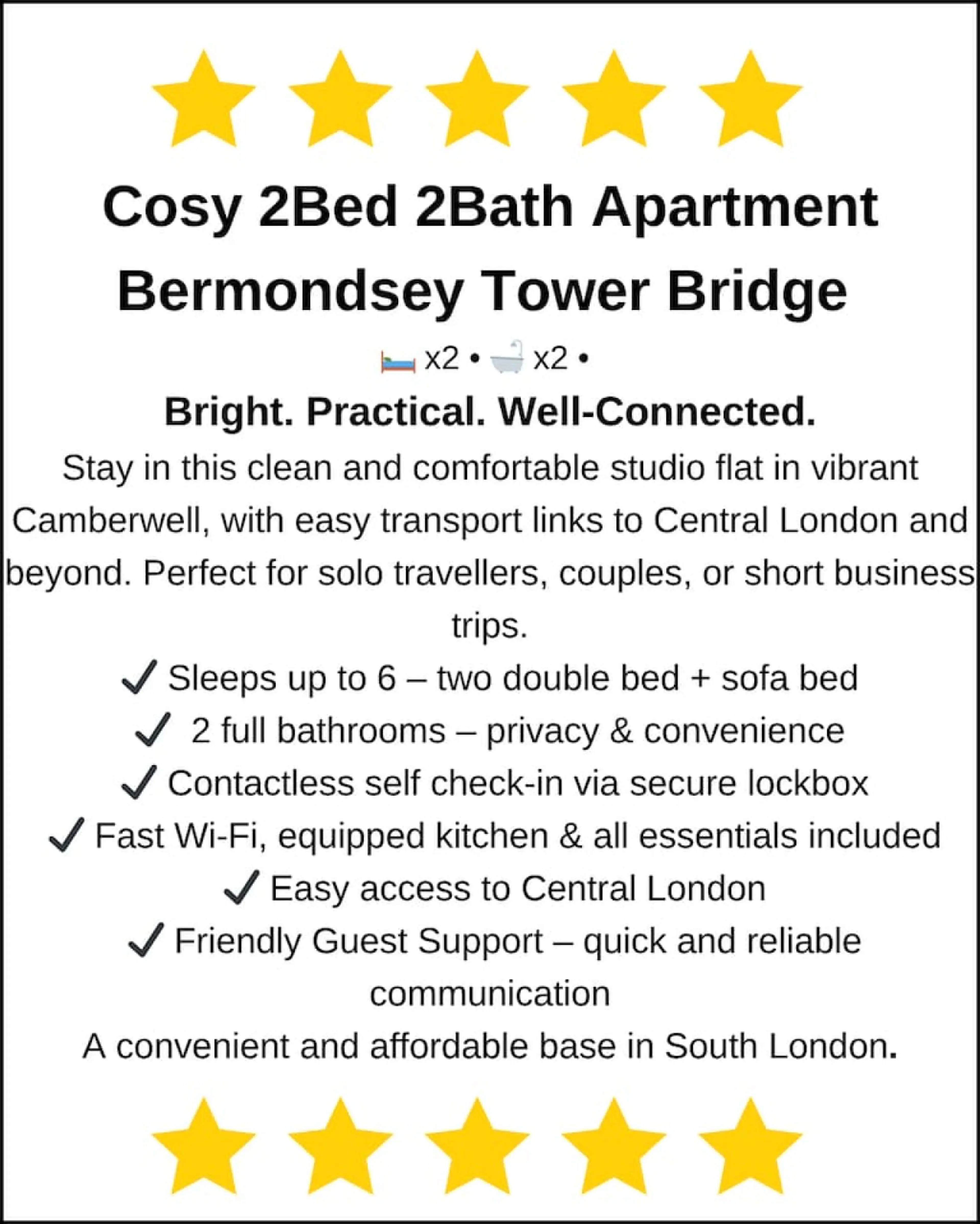 Cosy and contemporary, this spacious two‑bed, two‑bath flat in Bermondsey offers a master bedroom with ensuite plus a second double bedroom, ideal for up to four guests. A modern open‑plan kitchen and bright living area feature a smart TV and complimentary Wi‑Fi. Located just minutes from Tower ...